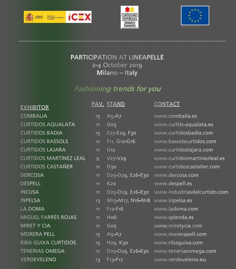 Acexpiel / Spanish Tanners le invita a disfrutar de una experiencia enriquecedora mientras visita los stands de Combalia, Curtidos Aqualata, Curtidos Badia, Curtidos Bassols, Curtidos Lajara, Curtidos Martinez Leal, Curtidos Castañer, Dercosa, Despell, Incusa, Inpelsa, La Doma, Miguel Farrés Rojas, Miret y Cia, Morera Pell, Riba Guixá, Tenerias Omega & Verdeveleno.